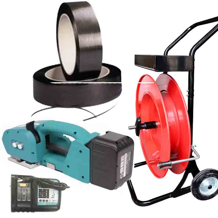 Seturi de legare cu bandă NEO 9-16mm PET/PP includ acumulator & încărcător + bandă PP 15.5mm – derulator de bandă cu cărucior